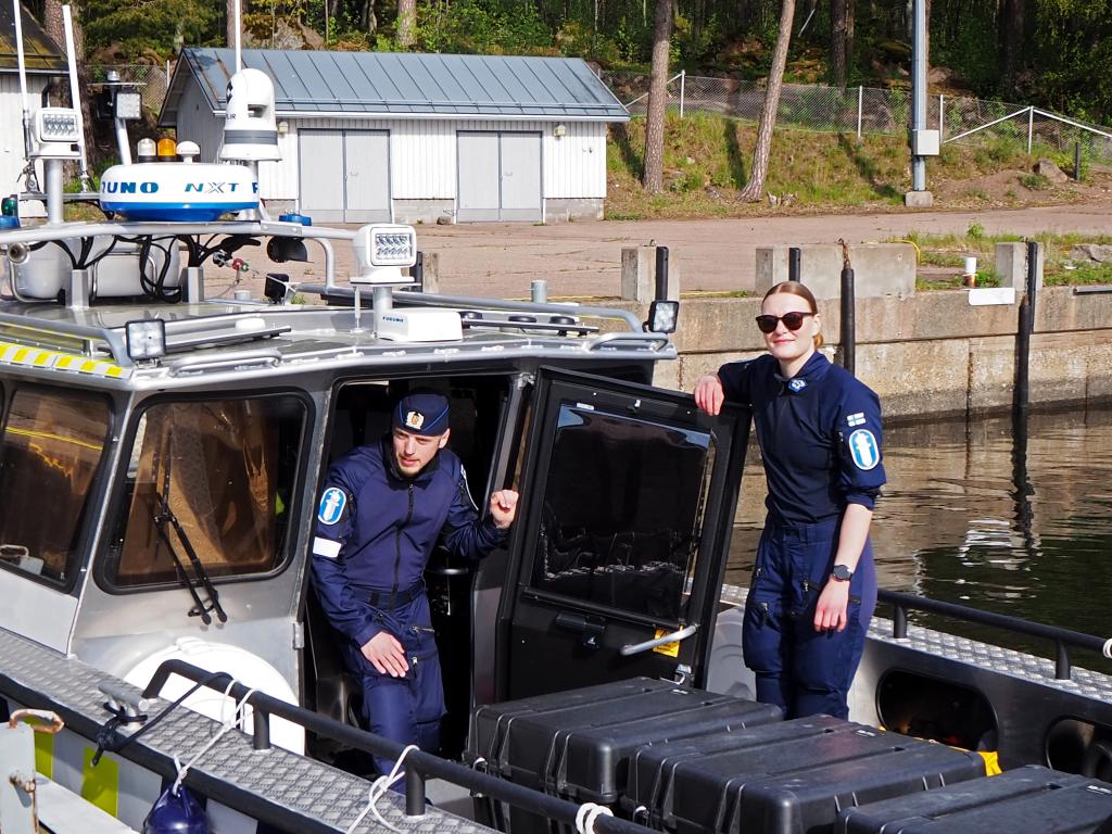 Milla Isohätälä ja Joakim Vesternees suorittivat venepoliisikurssin tänä vuonna. Molempien kesä on ollut täynnä mielenkiintoisia työkeikkoja vesillä.