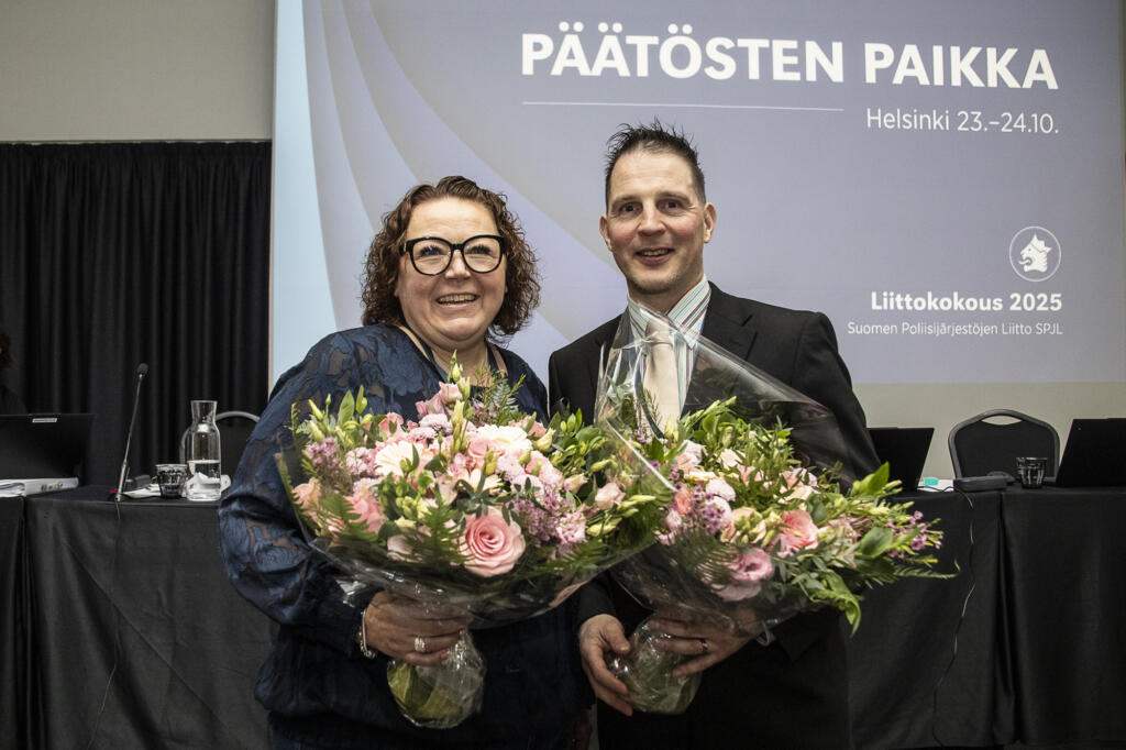 Kaksipäiväinen liittokokous käynnistyi komeasti avajaisilla, joissa esiintyi capella-lauluyhtye Club for Five. Päätöskappaleenaan yhtye esitti oman versionsa brittiläisen rock-yhtye Dire Straitsin vuonna 1985 tekemästä kappaleesta Brothers in Arms.Liittokokouspäivien ajan puhetta johtivat Teppo Viljanen ja Seppo Ijäs tukenaan liiton juristi Rita Ridanpää sekä sihteerit, juristi Jesper Thurin ja puheenjohtajan sihteeri Taija Puttonen.Liiton johtoon valittiin yksimielisesti Jonne Rinne (keskellä), jonka puheenjohtajuudessa käynnistyi samalla kolmas kausi. Hallitus piti heti liittokokouksen jälkeen järjestäytymiskokouksen, jossa se valitsi keskuudestaan liiton 1. varapuheenjohtajaksi Juho Gustafssonin ja 2. varapuheenjohtajaksi Outi Ahosen.Liittokokousedustajat pääsivät äänestämään valtuuston puheenjohtajista, sillä ehdolle oli asettunut useampi henkilö. Valtuuston puheenjohtajaksi valituksi tullut Anneli Kalervo ei pidätellyt hymyään vaalituloksen ratkettua. Varapuheenjohtajaksi äänestettiin Tomi Reinikainen.Strategia ohjaa liiton toimintaa. Liittokokouksen vahvistaman vuosien 2025–2029 ohjenuoran painopistealueiksi nousivat yhteiskunnallinen vaikuttaminen, SPJL:n lakko-organisaation ja alueellisen organisaation vahvistaminen sekä jäsentoiminnan kehittäminen positiivista jäsenkokemusta vahvistaen.SPJL:n liittokokous kantoi huolta siitä, miten sisäisen turvallisuuden ja oikeudenhoidon ammattilaiset selviävät tehtävistään, jos nykyisistä niukkuuden ajoista siirrytään kriisiin. Sen vuoksi edustajat esittivätkin mediatiedotteessa, että sisäisen turvallisuuden kriisivalmiutta tulisi parantaa.Hyväntuuliset miehet: uudelle kaudelle poliisihallinnon valtakunnalliseksi pääluottamusmieheksi valittu Marko Rikalainen ja varapääluottamusmieheksi valittu Tomi Sevander iloitsivat saamastaan luottamuksesta. Paikallisten luottamusmiesten vaalit ovat alueilla parhaillaan kesken.